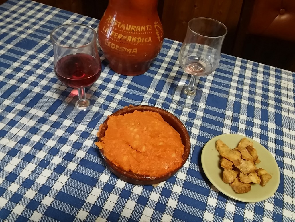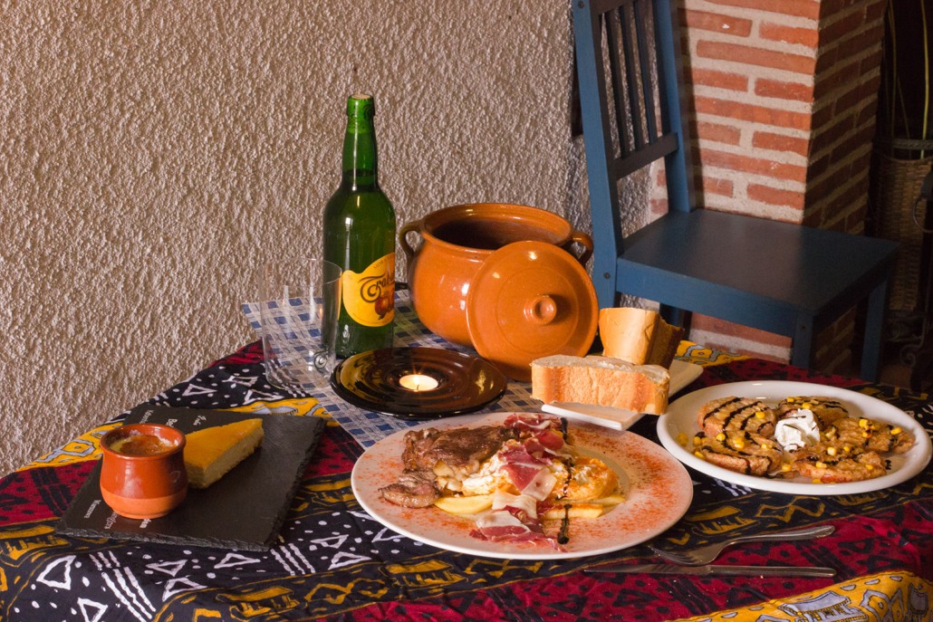 Patatas “meneás”, sopas de ajo, Huevos con farinato, rabo de toro, Tabla de quesos.
